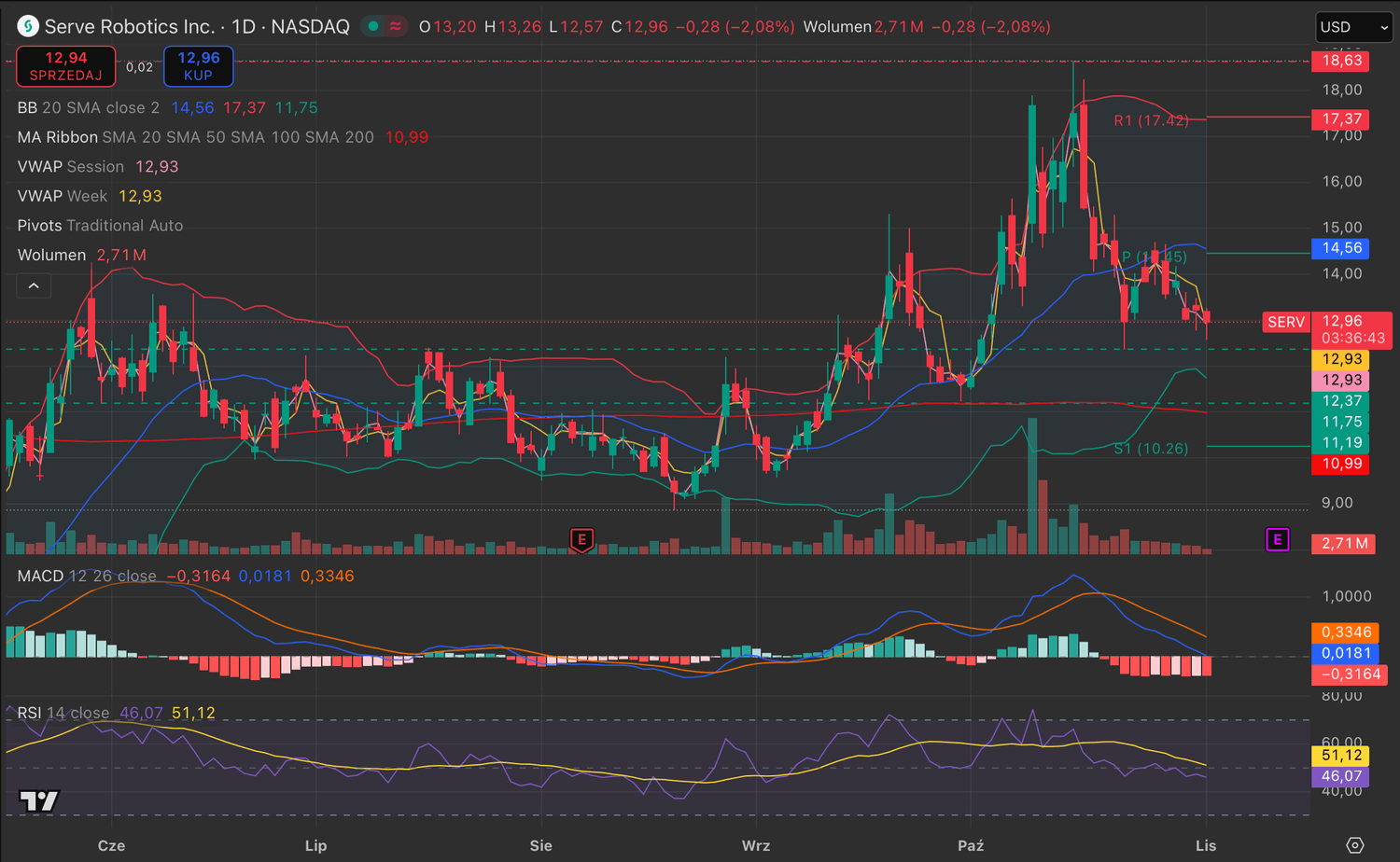 Cena SERV znajduje się poniżej SMA20 (14.55 USD) i SMA50 (10.99 USD), co pokazuje osłabienie krótkoterminowego trendu. Po mocnych wzrostach z września i października kurs wszedł w fazę konsolidacji.