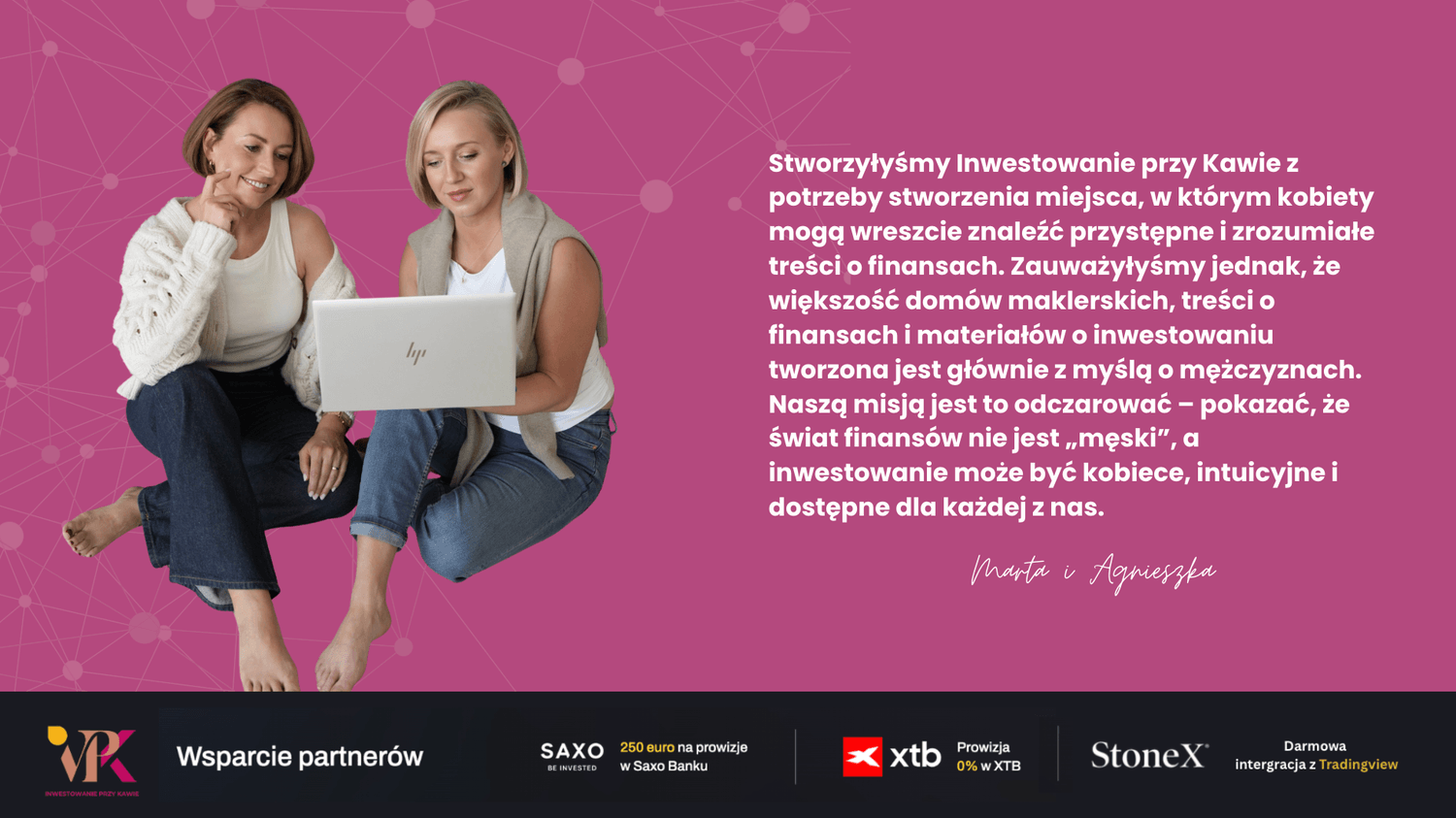 Stworzyłyśmy Inwestowanie przy Kawie z potrzeby stworzenia miejsca, w którym kobiety mogą wreszcie znaleźć przystępne i zrozumiałe treści o finansach. Zauważyłyśmy jednak, że większość domów maklerskich, treści o finansach i materiałów o inwestowaniu tworzona jest głównie z myślą o mężczyznach. Naszą misją jest to odczarować – pokazać, że świat finansów nie jest „męski”, a inwestowanie może być kobiece, intuicyjne i dostępne dla każdej z nas.