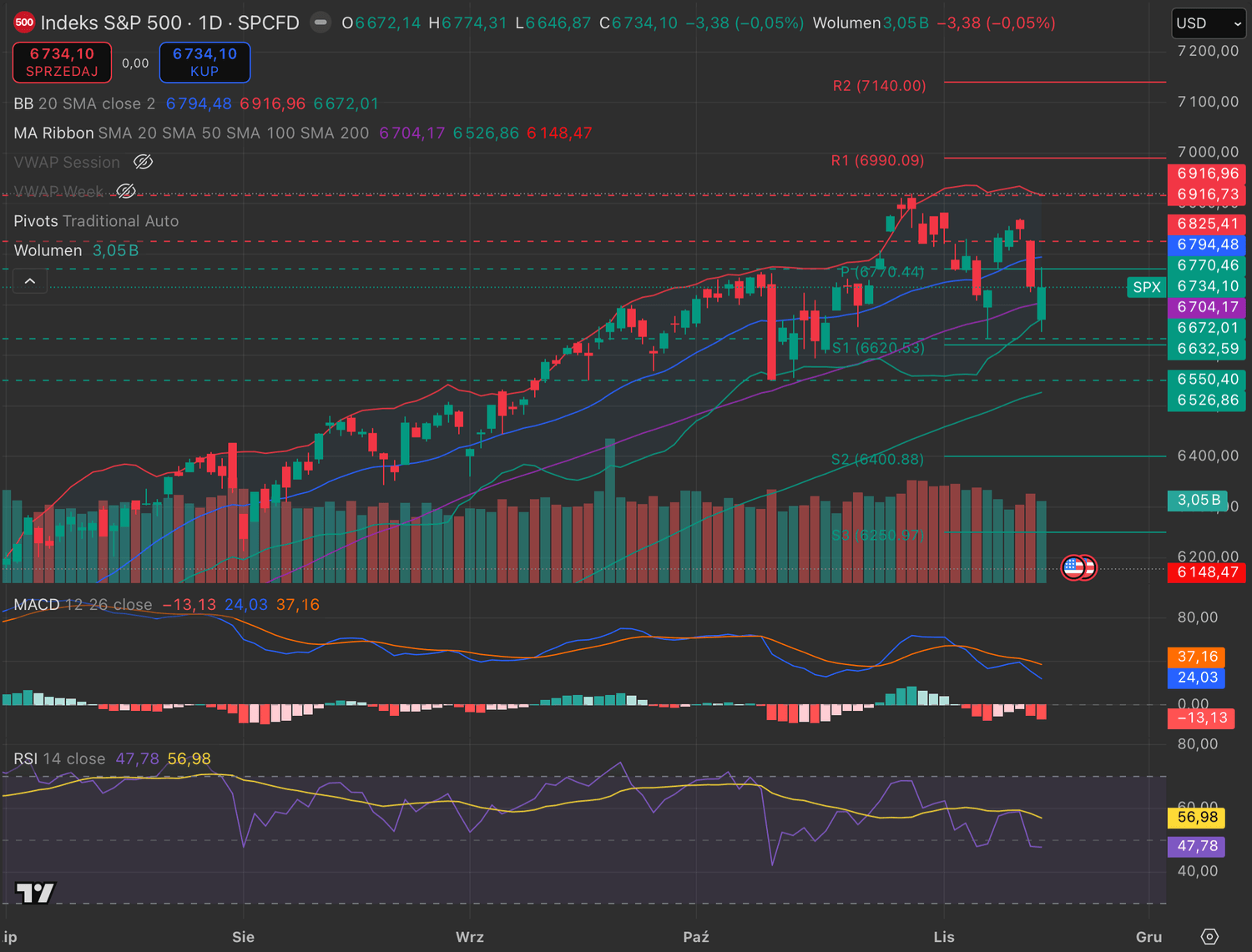 S&P 500 odbił od kluczowej strefy wsparcia 6632, pokazując pierwsze oznaki siły kupujących. RSI wchodzi w górę, a MACD zaczyna wygaszać momentum spadkowe. Jeżeli cena przebije średnią kroczącą SMA20, to otworzy się droga do wzrostów w kierunku najbliższych oporów.
