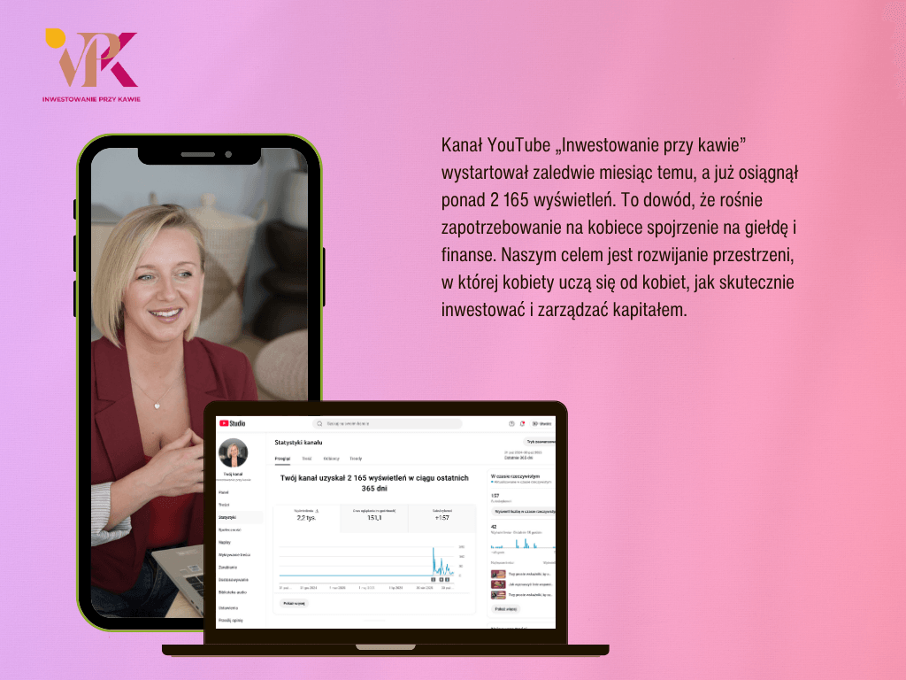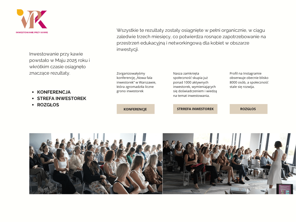 Inwestowanie przy kawie zyskało obecną formę w tym roku. Z małej grupy podsumowującej najważniejsze wydarzenia na giełdzie rozwinęłyśmy się w portal edukacyjny dla kobiet inwestujących świadomie. Już po 3 miesiącach zdobyłyśmy zaufanie ponad 1000 subskrybentek naszej interaktywnej grupy. Zorganizowałyśmy też konferencję dla ponad 100 aktywnych inwestorek w Warszawie, a dziś jesteśmy regularnie zapraszane na wydarzenia branżowe w roli ekspertek. Zostałyśmy także zauważone przez media: Sukces Pisany Szminką i Damosfera.